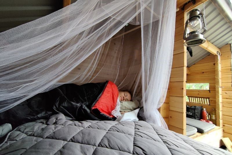 Jump in your sleeping bag for the sweetest dreams! Mosquito nets keep little friends away and storm lanterns create atmosphere.