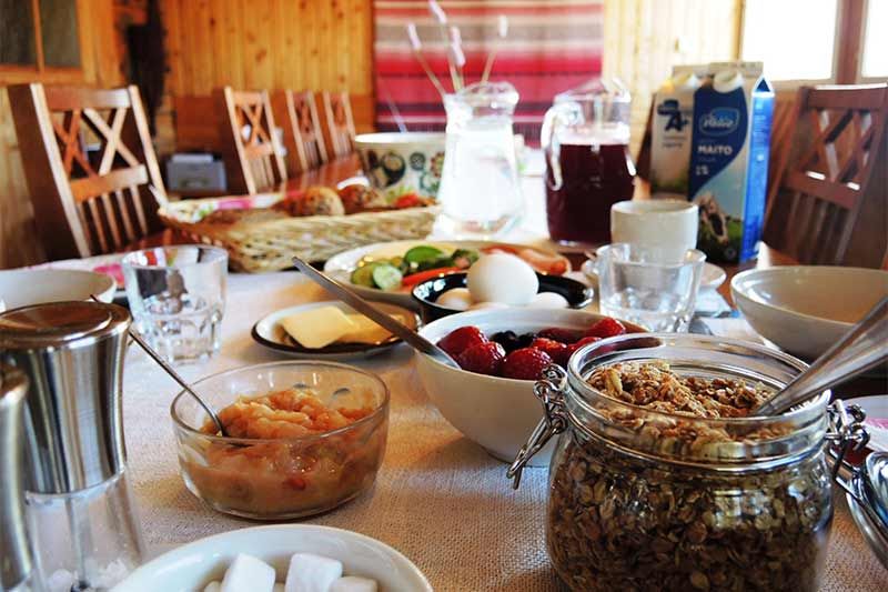 Majoitushintaan sisältyvä maalaisaamiainen tarjotaan kesäaikaan (1.6. – 31.8.) päärakennuksessa. Muina aikoina (1.9. – 31.5.) aamiainen on varattavissa lisämaksusta tai aamiaisen voi kokkailla niin keittiössä kuin puutarhan hiili- tai kaasugrillissä.